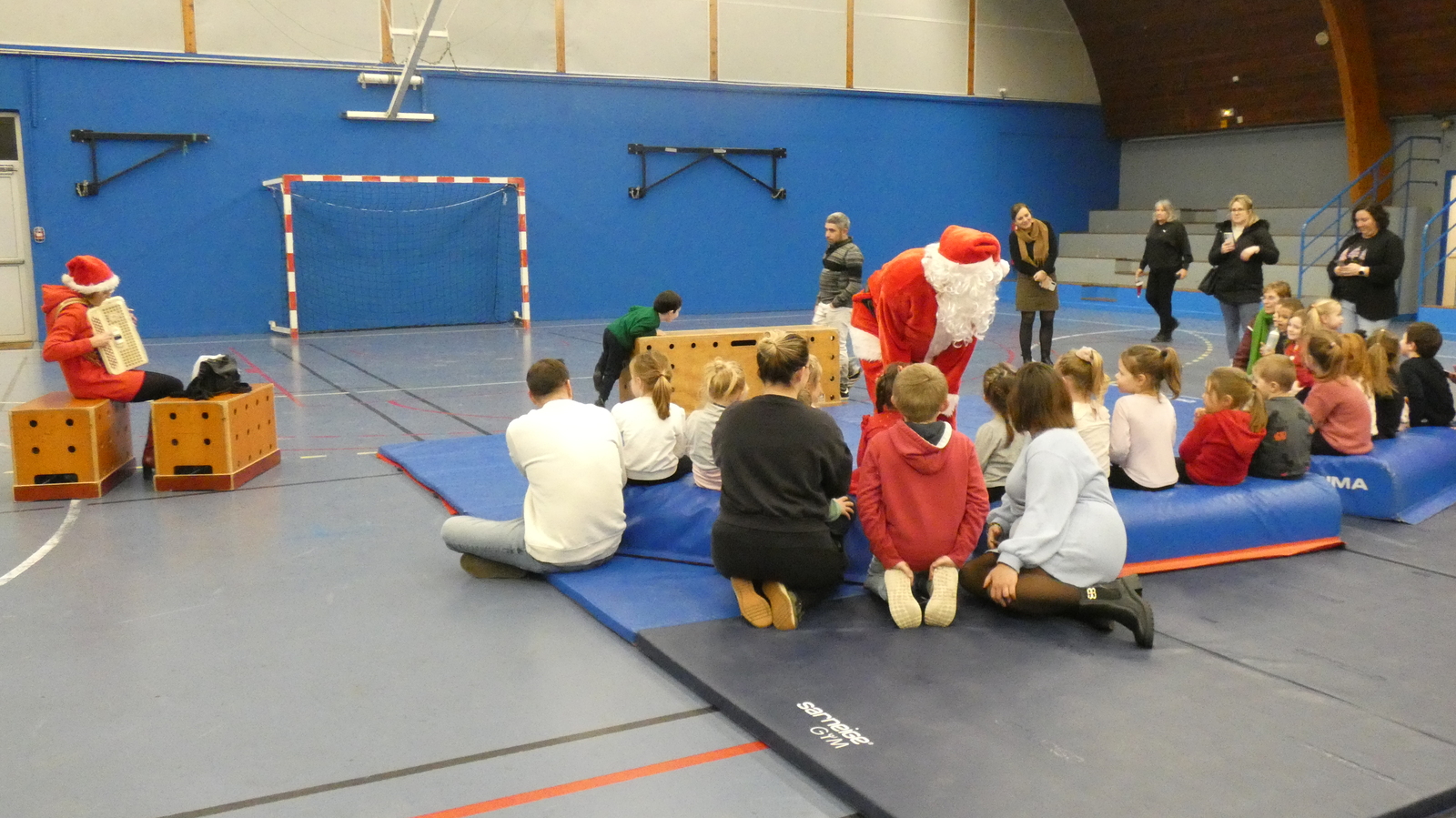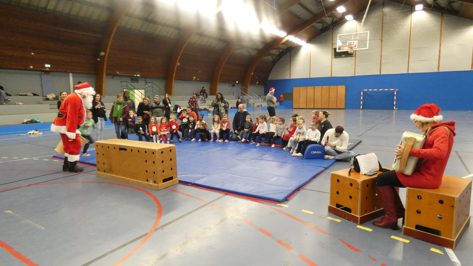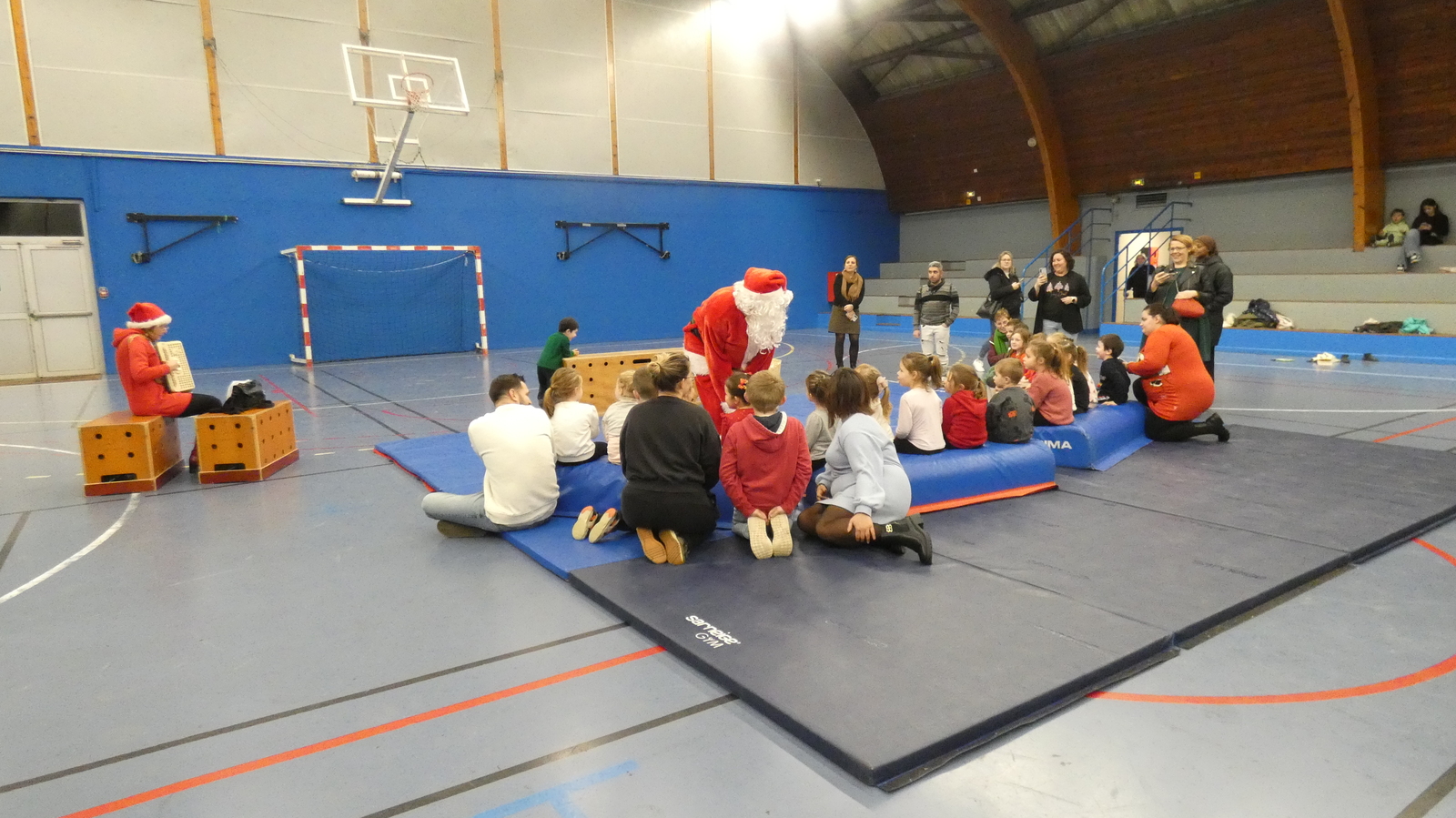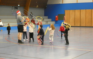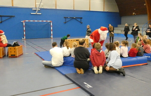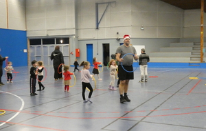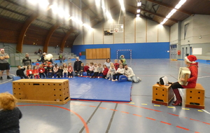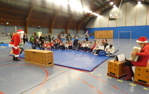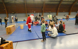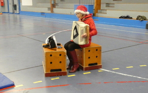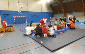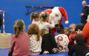 Ce soir, pour la dernière séance de l'année, le père Noël est venu à la rencontre des enfants de la section Baby-gym sur un air d'accordéon. A l'issu d'une séance adaptée, le Père Noël est venu échanger avec les enfants puis a distribué des sachets de friandises à ceux qui avaient été bien sages dans l'année.