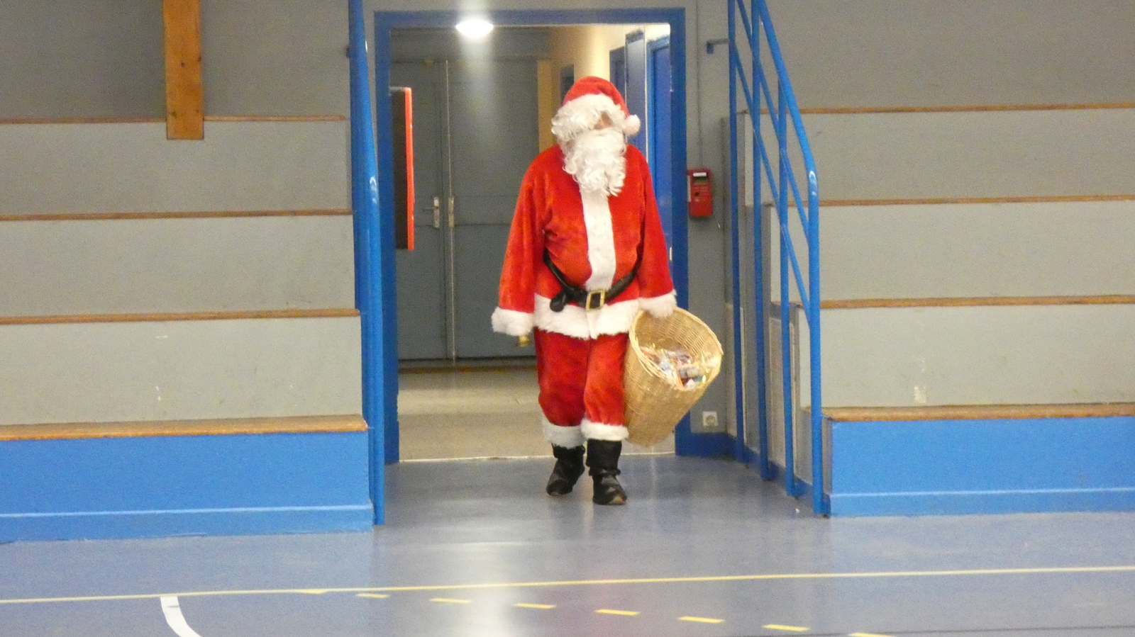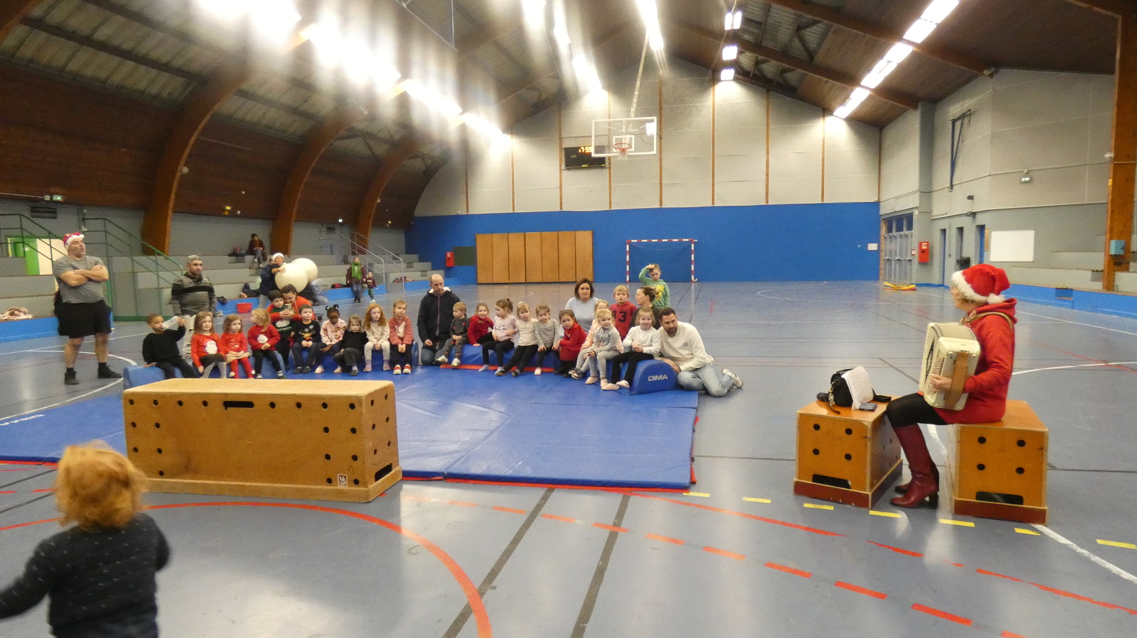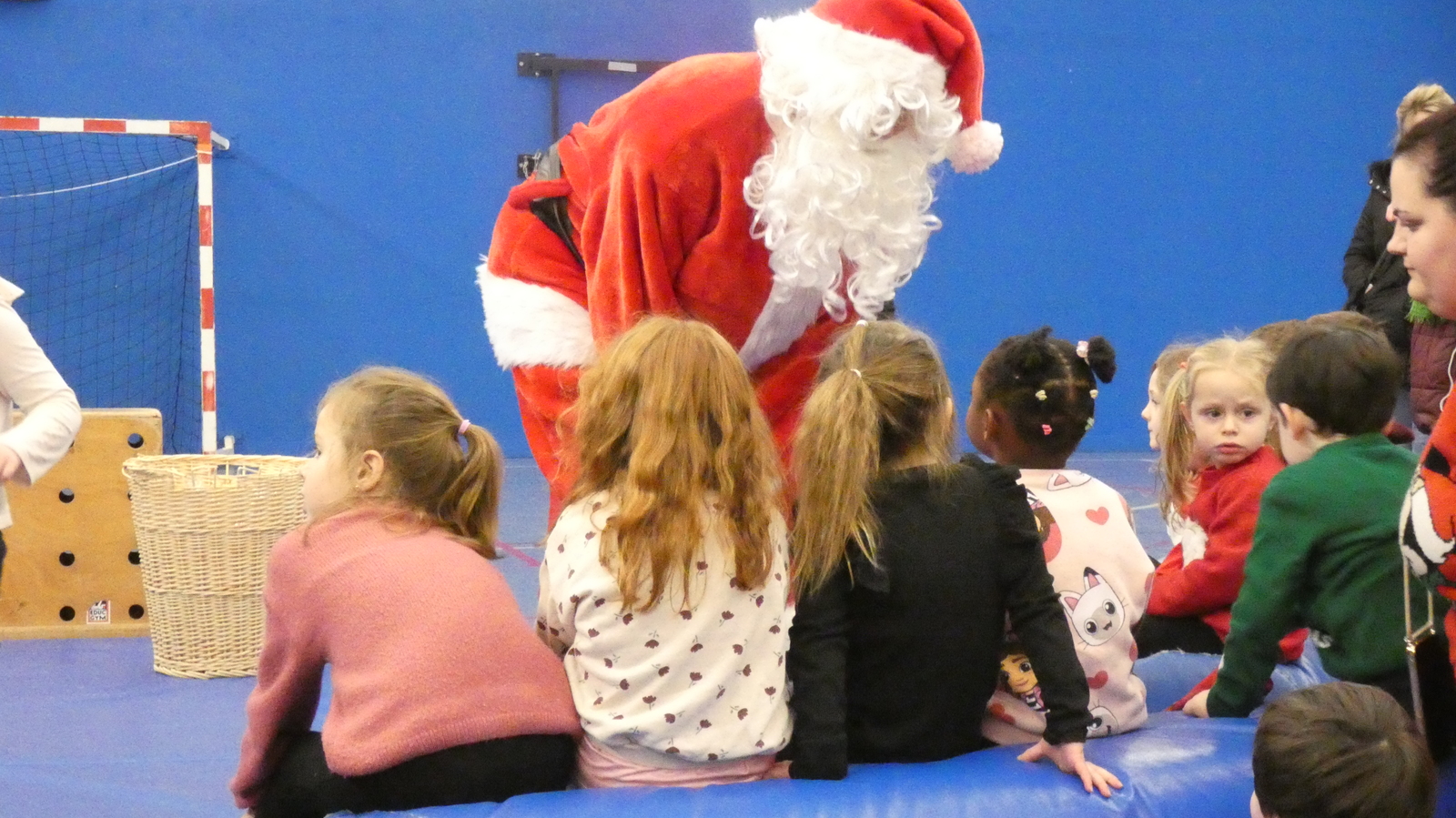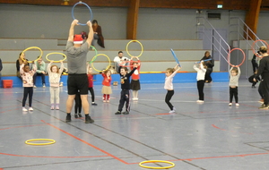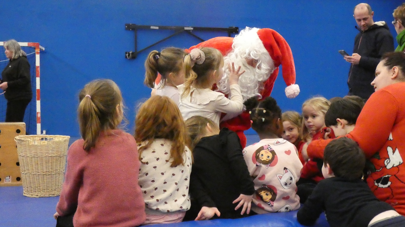 Ce soir, pour la dernière séance de l'année, le père Noël est venu à la rencontre des enfants de la section Baby-gym sur un air d'accordéon. A l'issu d'une séance adaptée, le Père Noël est venu échanger avec les enfants puis a distribué des sachets de friandises à ceux qui avaient été bien sages dans l'année.