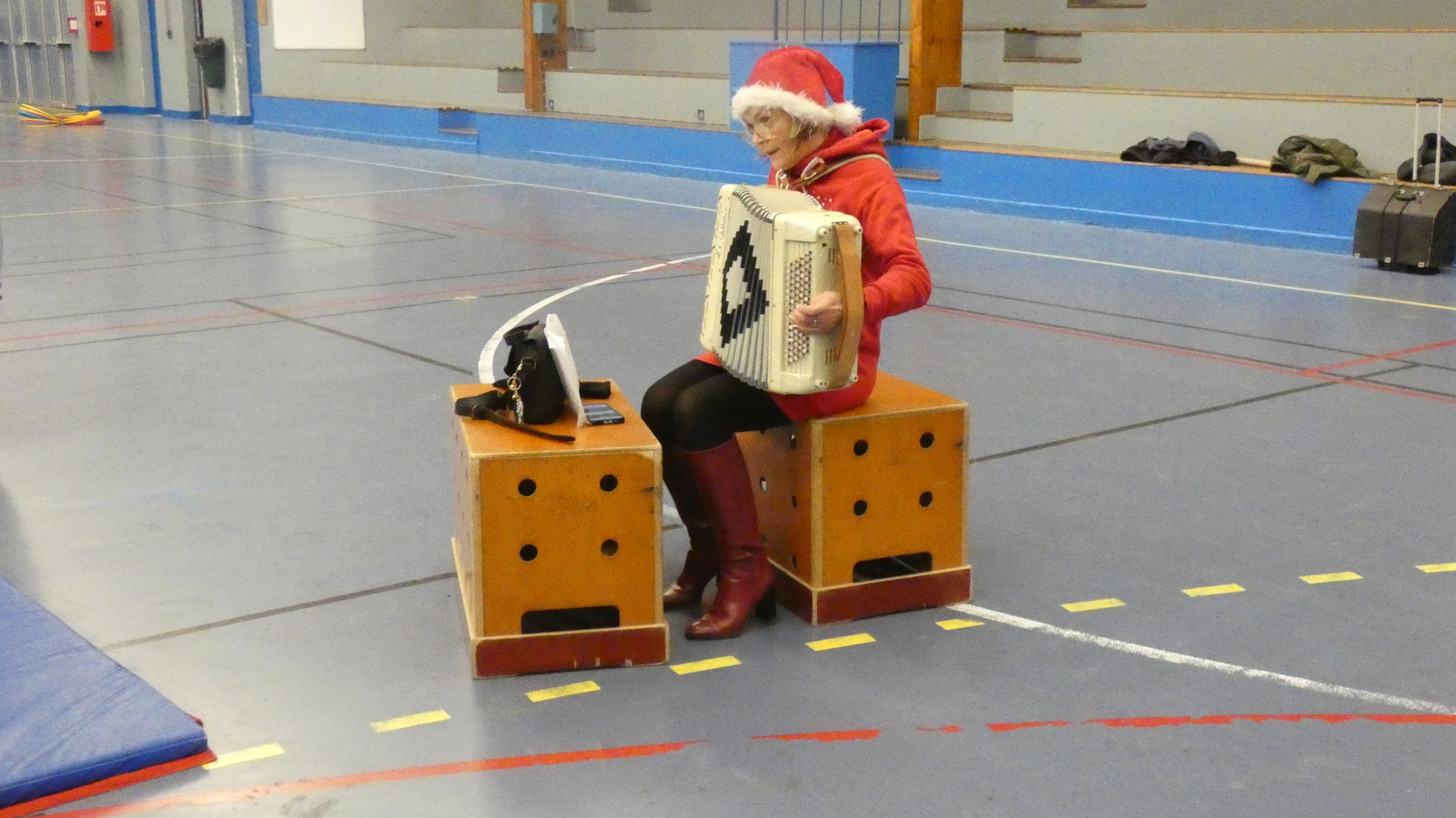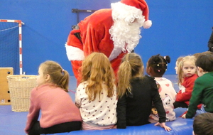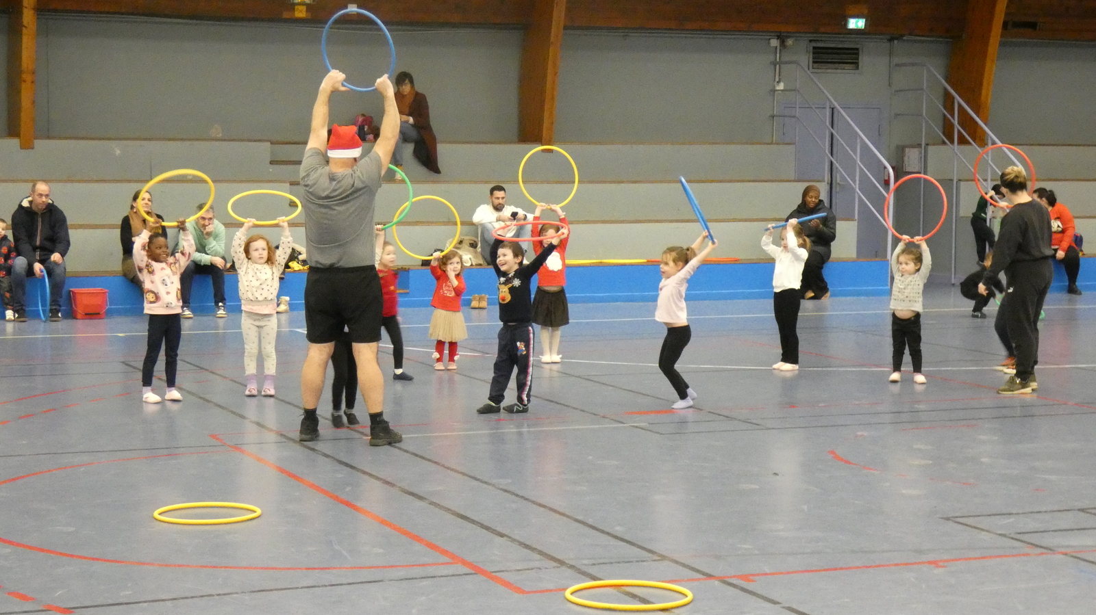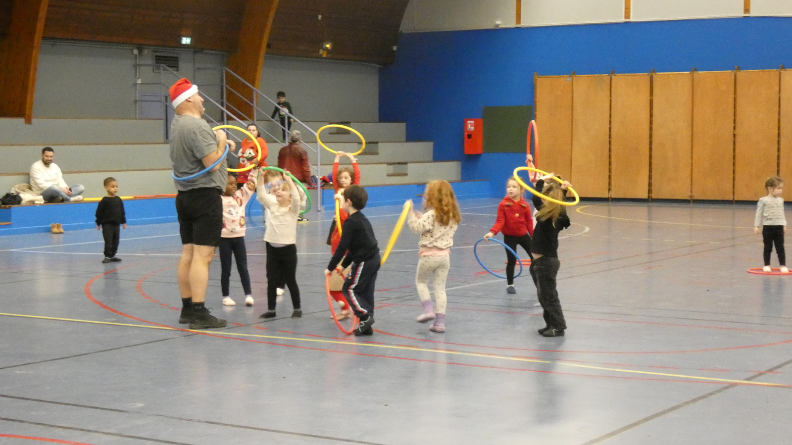 Ce soir, pour la dernière séance de l'année, le père Noël est venu à la rencontre des enfants de la section Baby-gym sur un air d'accordéon. A l'issu d'une séance adaptée, le Père Noël est venu échanger avec les enfants puis a distribué des sachets de friandises à ceux qui avaient été bien sages dans l'année.